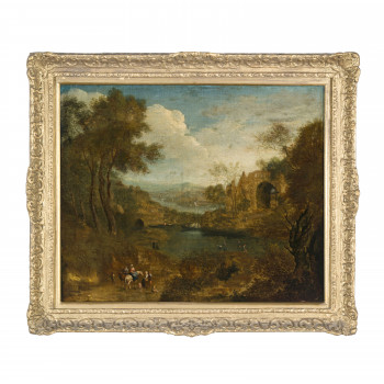 Scuola fiamminga del XVII/XVIII secolo Paesaggio fluviale con viandanti…