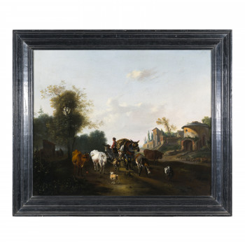 Scuola fiamminga del XVII/XVIII secolo Paesaggio con pastori e…