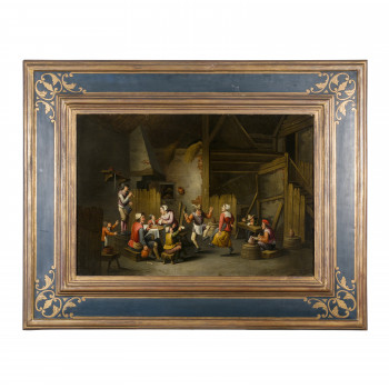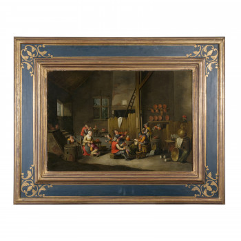 Scuola fiamminga del XVII secolo Interno di taverna Olio…