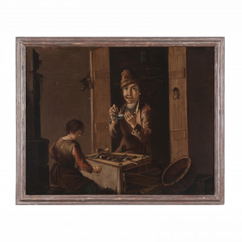 Scuola caravaggista del XVII secolo Scena d'interno Olio su…