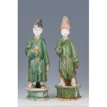Coppia di dignitari in terracotta invetriata Sancai, Cina, Dinastia…
